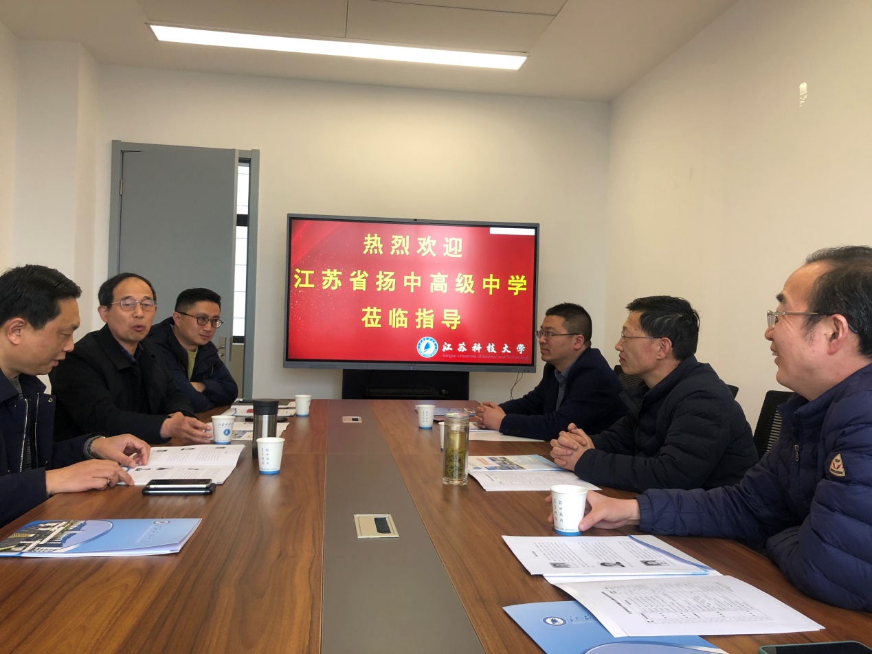 龙8-long8(中国)唯一官方网站党委书记韩斌教授首先欢迎省扬中高中一行来访长山校区,介绍了我校的办学历史,办学特色,教学科研,人才培养等概况,对“高校+高中”人才培养方式创新深入交换了意见。学生处蒋春雷处长就我校招生工作特色,学生管理模式进行了介绍,同时和省扬中高中老师就高中生心理教育交流了经验。学院吴健康副书记详细介绍了招生宣传最新特色——“江苏科技大学服务生源基地项目菜单”,共有“科技类、宣讲类、生涯规划、体验类、体艺类”五大类项目,在具体形式上与省扬中高中老师进行了深入探讨。