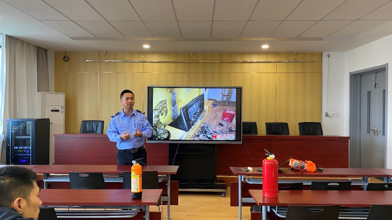随后刘警官就消防日常管理、平常检查、遵守以及疏散逃生的基本常识、消防火灾的应急和预防进行了深入的讲解。在此期间,刘警官着重介绍了逃生必备器材:家用灭火器的类型及使用方法。其类型主要分为三种,分别为:二氧化碳灭火器,干粉灭火器,水基环保灭火器。前两种灭火器大家都比较熟悉,因此重点谈及了水基环保灭火器的使用方法及注意事项,并提醒如何正确购买灭火器。