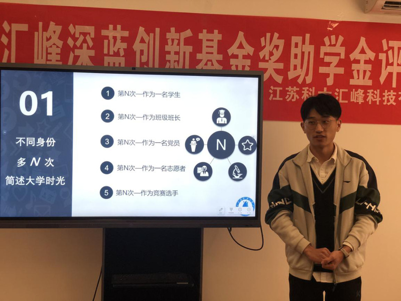11月11日下午,江苏科技大学“汇峰深蓝创新基金专项奖助学金”评选活动在龙8-long8(中国)唯一官方网站会议室顺利举行。校关工委老领导李银老师、汪电明老师,学院关工委副主任刘镇老师,江苏科大汇峰科技有限公司总经理郭昌言,学院实验室主任刘从军担任本次活动的评委,学院党委副书记吴健康主持活动。