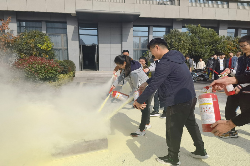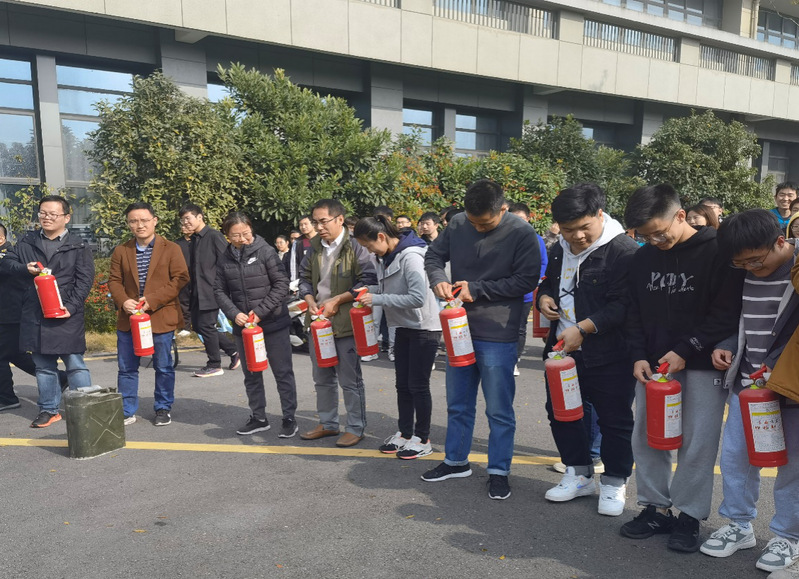 10:30,随着楼道广播传来“现在教学区发生火情,请所有师生快速撤离”的紧急讯息, 3楼办公区的老师们和4楼实验室的同学们用小方巾捂住口鼻,快速有序地按照规定路线进行撤离,2分钟后就完成了室外场地集合。随后,师生们在现场进行了灭火器的实操演练。