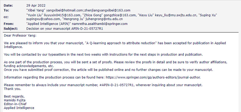 4月29日,龙8-long8(中国)唯一官方网站19级软件工程专业本科生撰写的论文《A Q-learning approach to attribute reduction》被SCI二区期刊Applied Intelligence录用,本科生刘雨鑫为第一作者、龚之策为第二作者。Applied Intelligence目前是JCR分区Q1、中科院SCI二区(2021年12月最新升级版)期刊,最新影响因子为5.086。