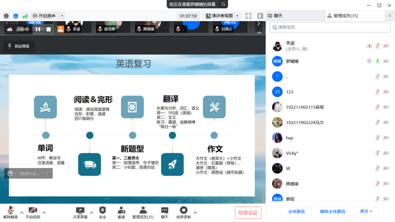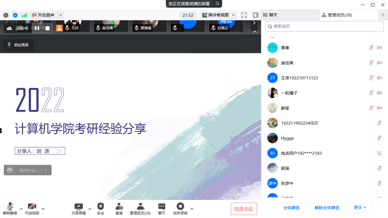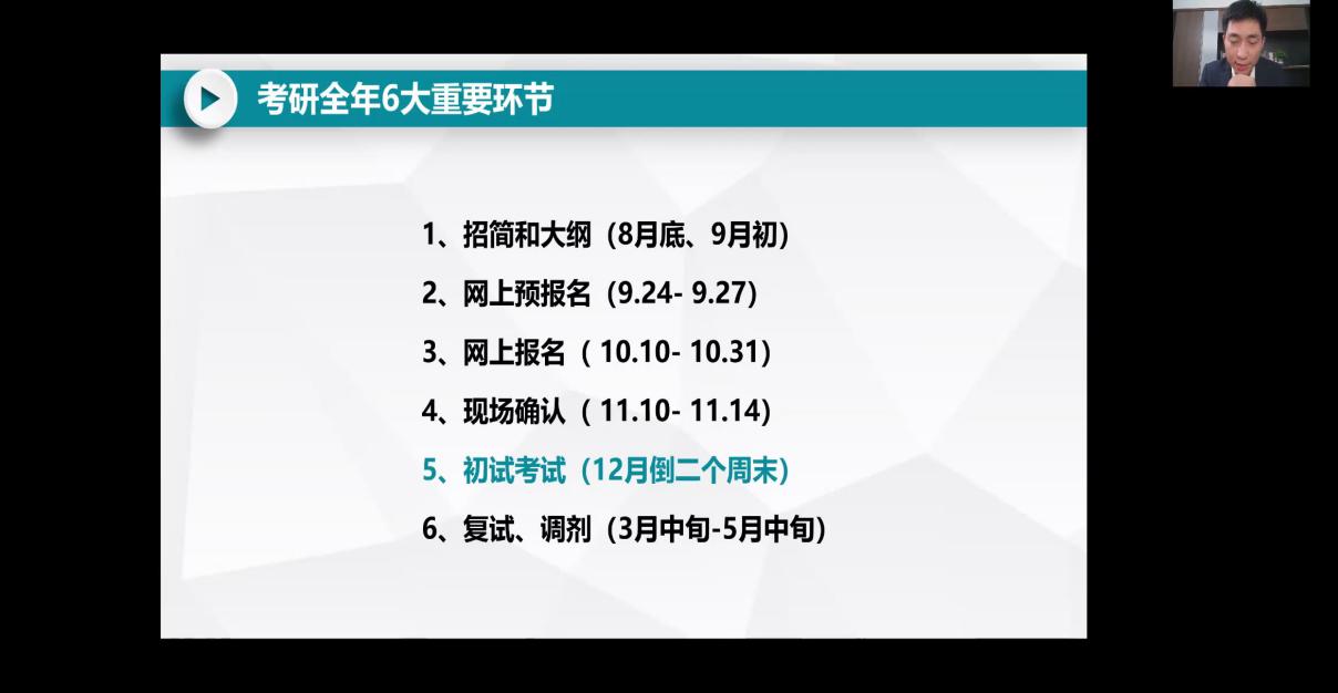 22位学长、学姐从考研目标学校的确定、复习时间的规划、各科复习的技巧、心态的调整、调剂的注意事项以及如何平衡好学业和复习等方面为学弟、学妹们做了详尽的分享。此外,在最后一场分享会中,学院还邀请了硕士研究生考试资深顾问陈忠老师为同学们做考研择校及复习指导,陈老师介绍了考研6大环节,建议同学们在择校时先确定专业,再选择地区,最后确定院校。