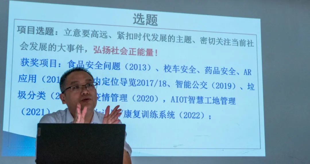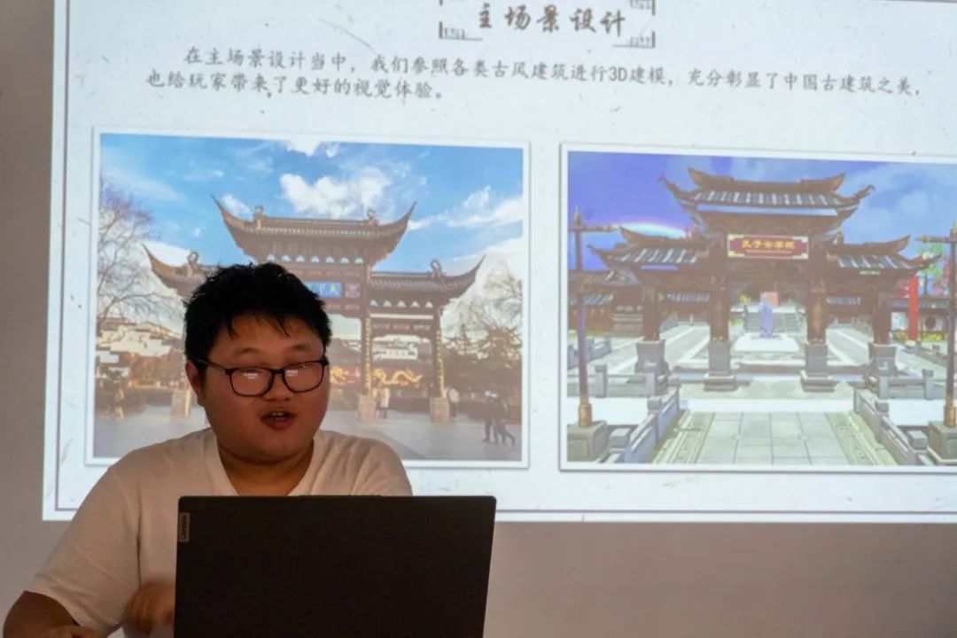 谷文一同学所在团队把握市场需求,研发了基于Unity3D的汉语言文化应用作品,从研发过程中遇到的困难,主场景设计,参考了中国古建筑之美,游戏体验中实现了数据上云功能和最近任务点寻路算法。谷文一同学对参赛项目进行了生动讲解,大大开阔了参会学生的眼界,提高了参会学生对科研工作与科技竞赛的了解程度与参赛热情。