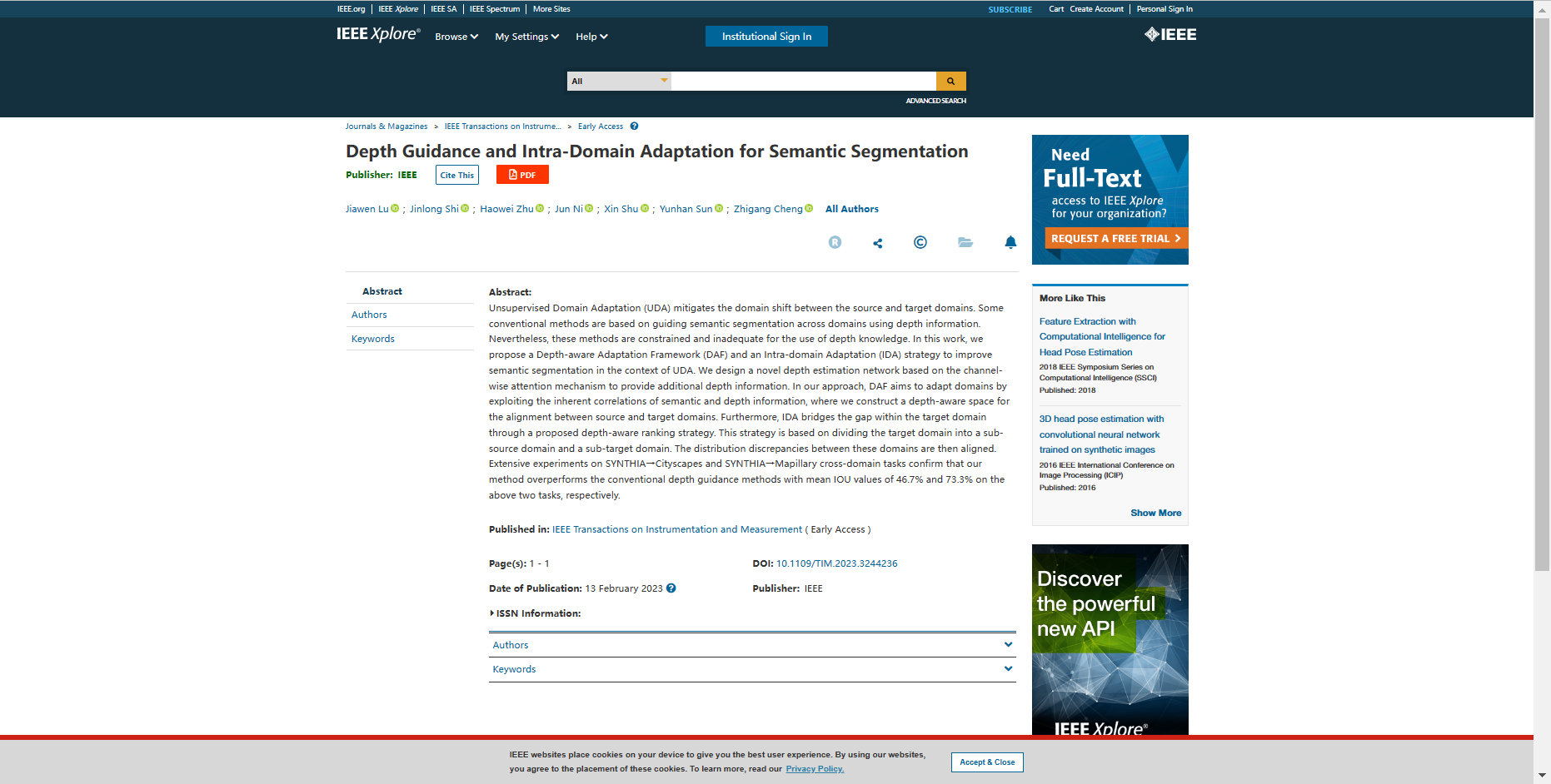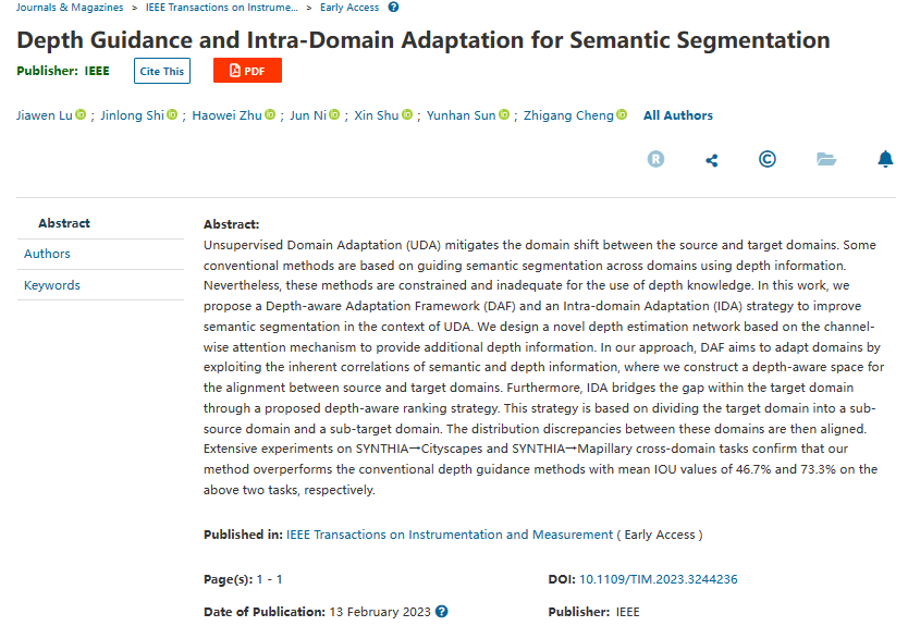 近日,我校龙8-long8(中国)唯一官方网站2020级硕士研究生卢加文以第一作者,史金龙教授为通讯作者,在计算机仪器仪表学TOP期刊IEEE TRANSACTIONS ON INSTRUMENTATION AND MEASUREMENT上发表了题为“Depth Guidance and Intra-Domain Adaptation for Semantic Segmentation”的高水平学术论文。