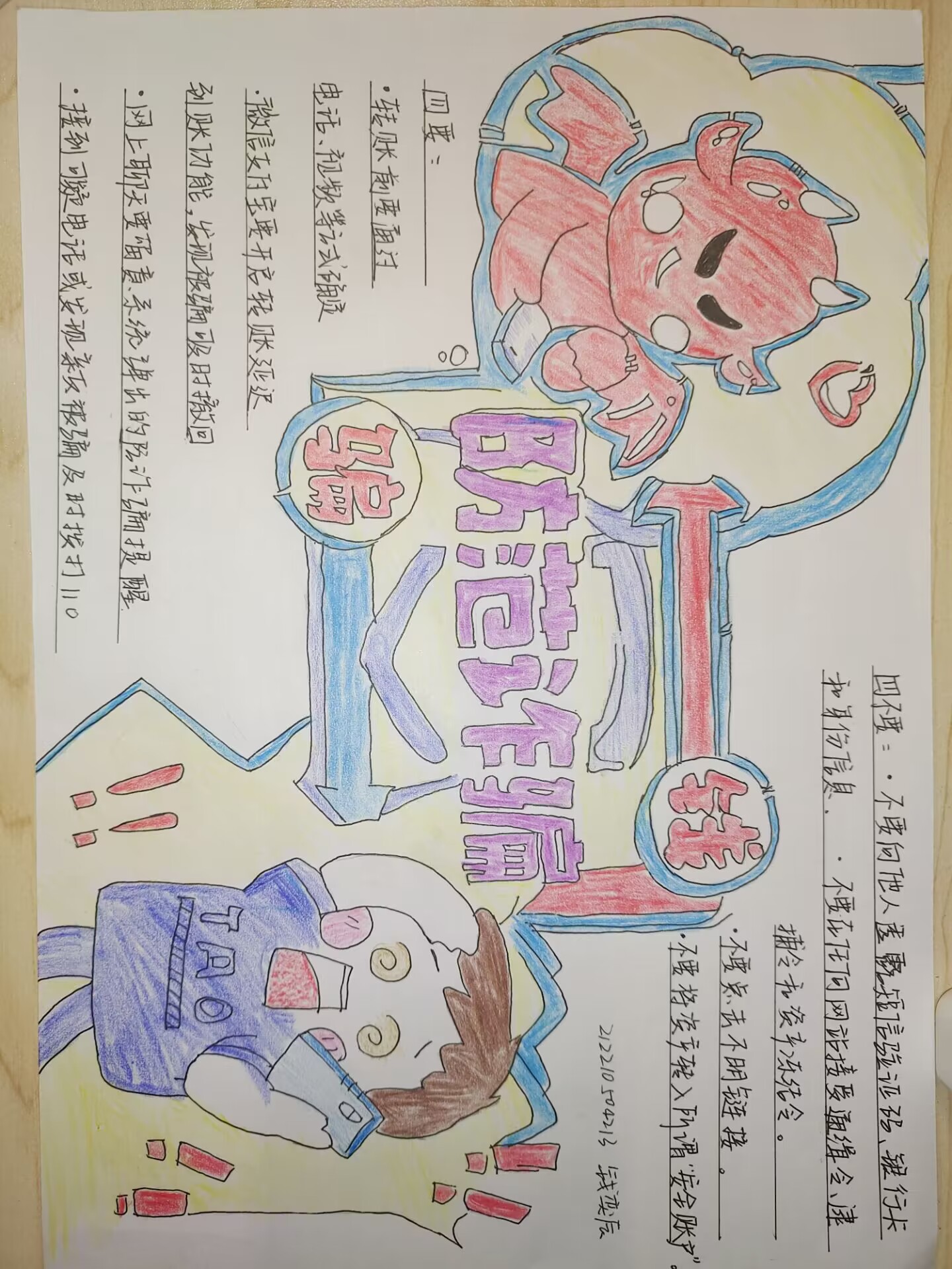 防诈骗海报以“你我同心·防诈同行”为主题,围绕冒充公检法、购物退款诈骗、贷款诈骗、兼职刷单和冒充熟人诈骗等内容展开。本次活动以海报、手抄报、创意画设计的形式提醒广大同学警惕各类诈骗形式和诈骗手段,在潜移默化中有效地宣传了校园防诈知识,营造了全校共同参与防诈宣传的浓厚氛围。
