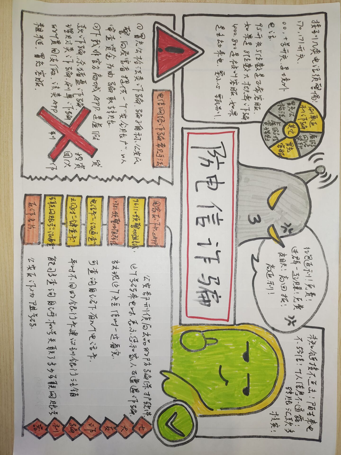 防诈骗海报以“你我同心·防诈同行”为主题,围绕冒充公检法、购物退款诈骗、贷款诈骗、兼职刷单和冒充熟人诈骗等内容展开。本次活动以海报、手抄报、创意画设计的形式提醒广大同学警惕各类诈骗形式和诈骗手段,在潜移默化中有效地宣传了校园防诈知识,营造了全校共同参与防诈宣传的浓厚氛围。