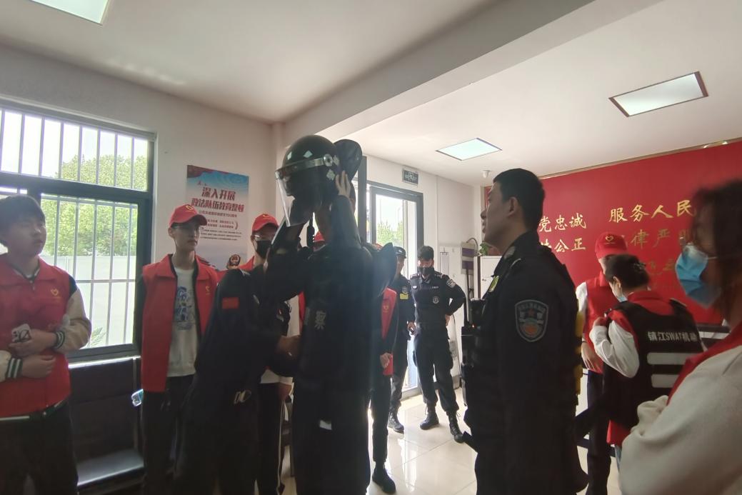 巡逻结束后,大家返回警务站集合。特警同志召集大家认识并试戴警务站所配备的装备,同时详细为大家解释了装备用途。其中一名成员试穿了警务工作站的防爆服,并在特警同志的帮助下体验了盾牌和棍棒制服敌人的正确做法。