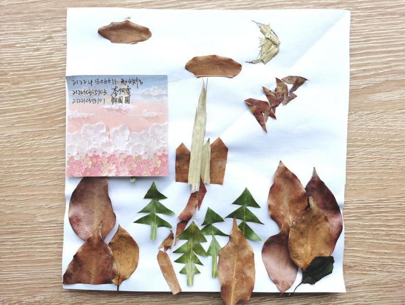 赵欣怡、李何雯、鲍圆圆三人通过简单的剪裁和拼贴将落叶拟成月亮、云朵、松树、城堡等意象,向我们展现了一副月下森中城堡图,极具抽象美感。