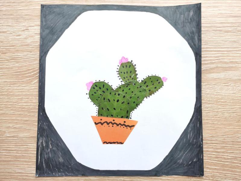 刘佳、冷金焱、刘瑜婷通力合作,通过粘、剪、画等方式将落叶制作出一盆向阳生长的仙人掌,坚韧顽强、充满活力和生机,正如我们新时代之青年,昂扬、蓬勃向上。