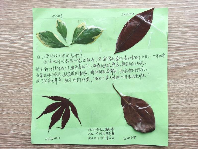 上图是陈前程等三位同学带来的作品,他们收集四时之叶,代表江科大老师们的四季陪伴,“落红不是无情物,化作春泥更护花”,表达了对老师们的感激和感谢之情。