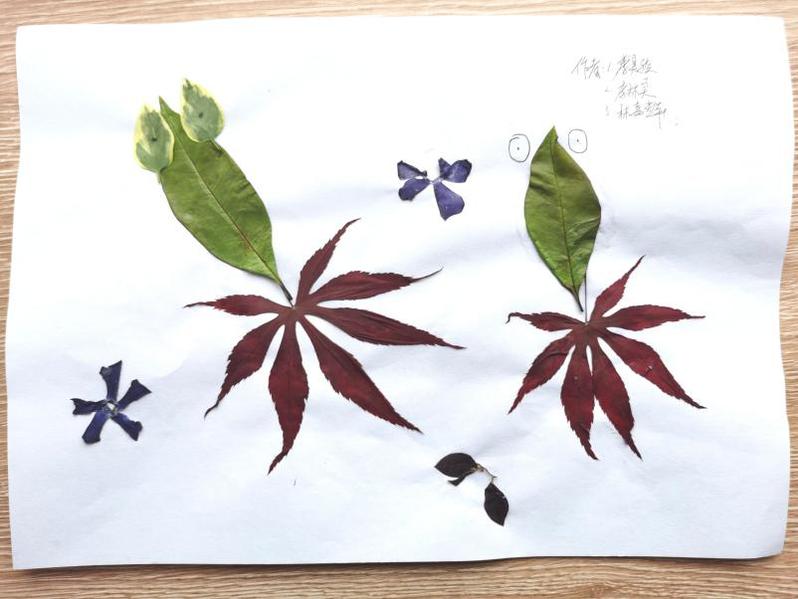 李昊骏、林嘉辉、李林昊同样也是金鱼主题的作品,他们利用不同颜色的落叶将金鱼点缀的更加丰富多彩,充满活力,别具一格。
