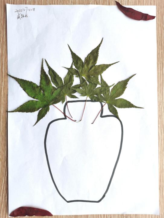 戚锦松巧妙利用鸡爪槭落叶的形状优势,将金鱼点缀的活灵活现,宛若水中游;第二份作品主要以绿色为主调,通过简单的落叶组合勾勒出花瓶意象,给人一种宁静淡然的感受。