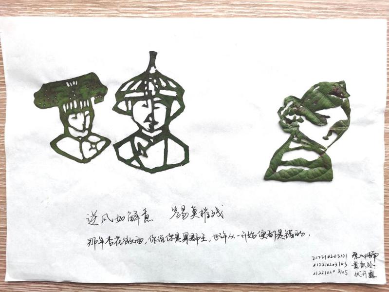 “逆风如解意,容易莫摧残”,蔡帅楠、董凯玲、伏开露三人用落叶进行剪裁和拼接,生动传神地重现了《甄嬛传》的名场面,展现了他们对该经典影视剧的深入研究以及大学生多姿多彩的课外娱乐生活。