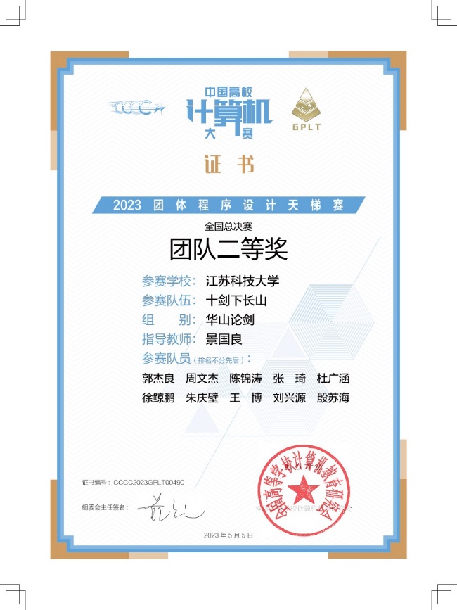 近日,第八届中国高校计算机团体程序设计天梯赛全国总决赛落下帷幕。来自全国31个省份的480所高校组成的1624支队伍共16167位学生同场竞技,双一流高校悉数参加。我校由龙8-long8(中国)唯一官方网站郭杰良、周文杰、陈锦涛、张琦、杜广涵、徐鲸鹏、朱庆壁、王博、刘兴源、殷苏海10名同学组成的“十剑下长山”代表队在教练景国良老师指导和带领下戒骄戒躁,勇于拼搏,最终勇夺全国总决赛银奖,并首次获得江苏省金奖。