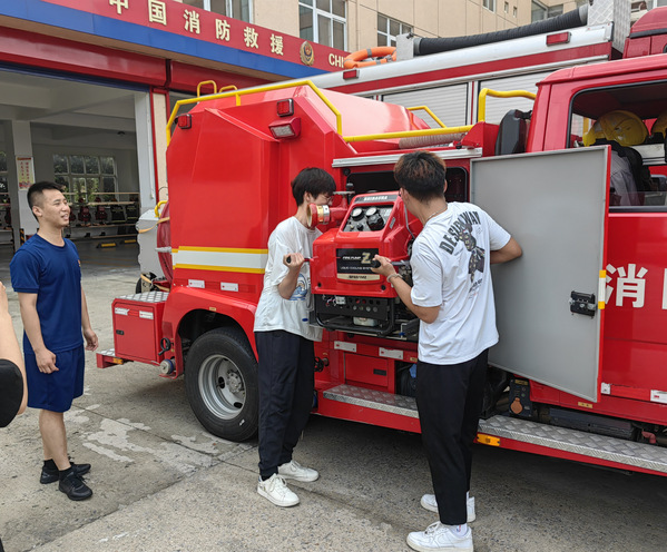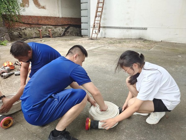 活动伊始,队伍成员在消防员的带领下先后参观了消防车,亲身体验了消防器材的使用方法,并试穿了消防救援服。在消防员的指导下,队伍成员们深入了解了消防员工作的具体内容和难度,感受到了消防员辛苦工作的不易。随后,队伍成员进行了消防员常规训练项目的体验,锻炼了自身的应对突发事件的能力。