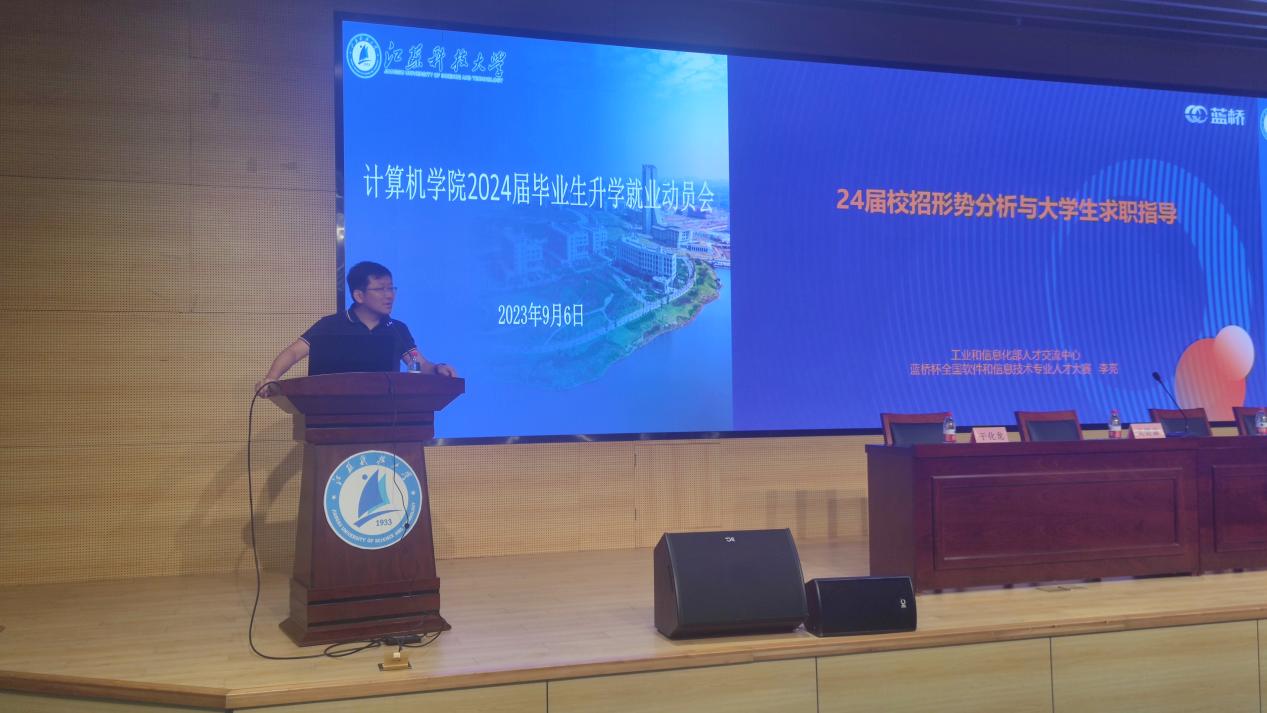 院长杨习贝作升学就业动员。杨习贝首先向同学们介绍了学院2023届毕业生升学就业的情况。他建议考研的同学要学会提前调研,充分获取信息,在进行研究生报考的学校和专业选择时,要结合学校的专业实力、学科发展前景、导师配备等因素,选择适合未来发展的学科平台继续深造,也呼吁大家积极报考江科大。同时,对于就业的同学,杨习贝表示同学们要树立正确的就业观念,既要提高就业实战技能,又要积极把握秋招的黄金就业时机,在充满变化的时代,思考更要具备前瞻性、全局性。