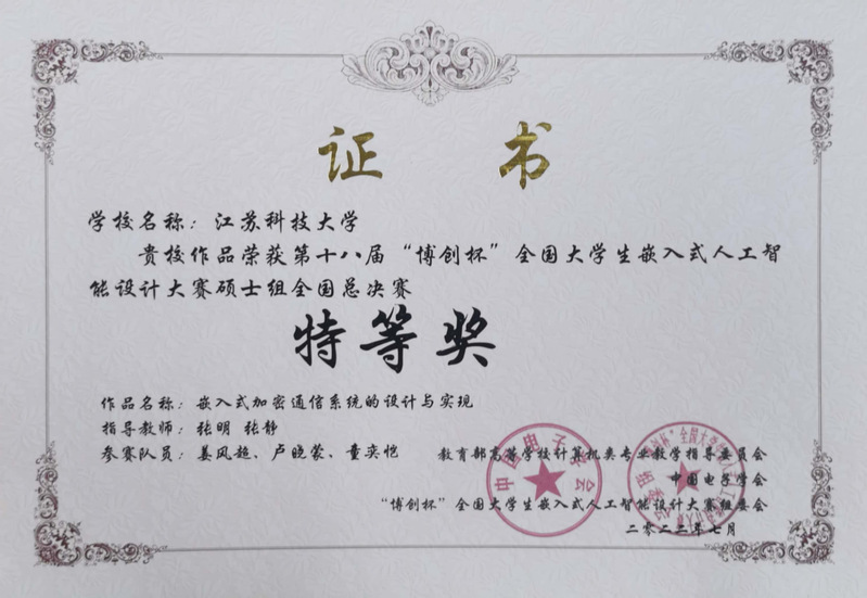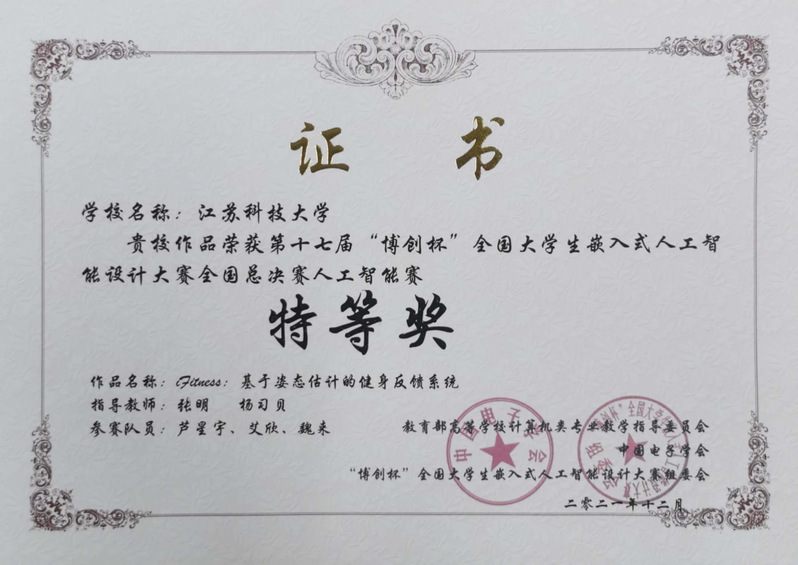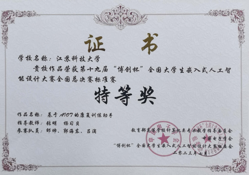 龙8-long8(中国)唯一官方网站移动应用创新实验室近年来围绕嵌入式人工智能设计开发、康复训练、物联网人工智能算法、物联网平台、生物信息学等展开了一系列卓有成效的研究。同时实验室注重产学研一体化,积极推动产学研紧密结合,与企业、康复医院、社区等开展了一系列合作研究。为培养德智体美劳全面发展、具有运用信息技术解决实际问题的综合创造能力的学生提供了实践创新平台。2021年由张明、杨习贝老师指导,芦星宇等同学完成的《基于姿态估计的健身反馈系统》获得全国总决赛人工智能赛特等奖。2022年由张明、张静老师指导,姜风超等同学完成的《嵌入式加密通信系统的设计与实现》获得硕士组全国总决赛特等奖。2023年由张明、杨习贝老师指导,邵帅等同学完成的《基于AIOT的康复训练助手》获得全国总决赛标准赛特等奖。