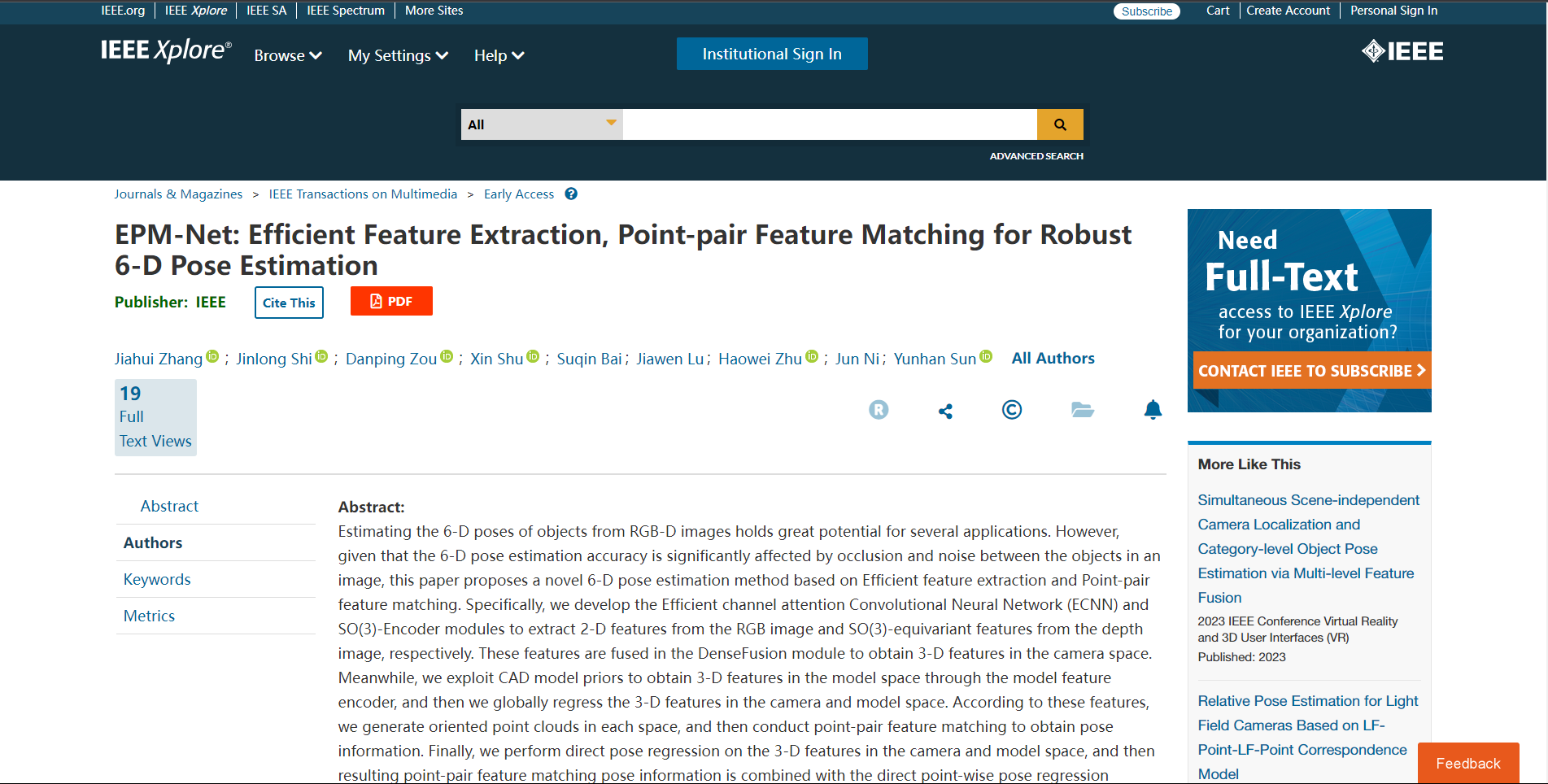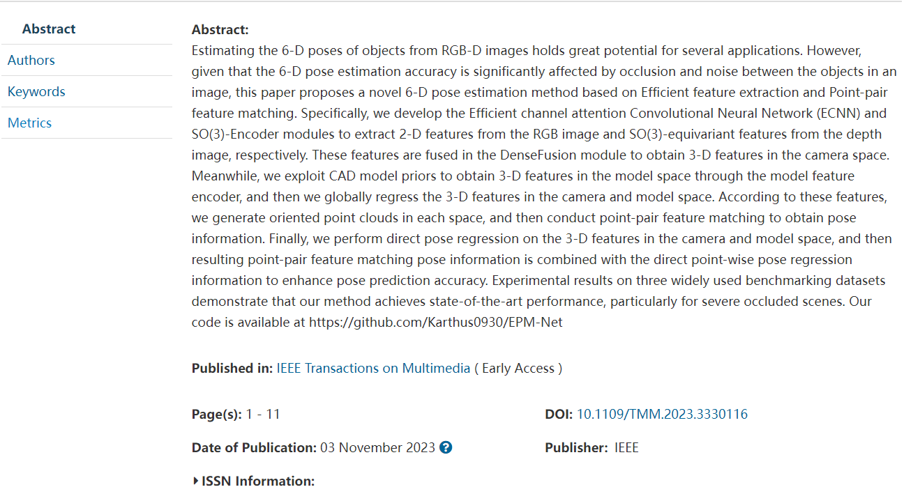 近日,我校龙8-long8(中国)唯一官方网站2021级硕士研究生张家辉以第一作者,史金龙教授为通讯作者,在多媒体TOP期刊IEEE TRANSACTIONS ON MULTIMEDIA上发表了题为“EPM-Net: Efficient Feature Extraction, Point-pair Feature Matching for Robust 6-D Pose Estimation”的高水平学术论文。