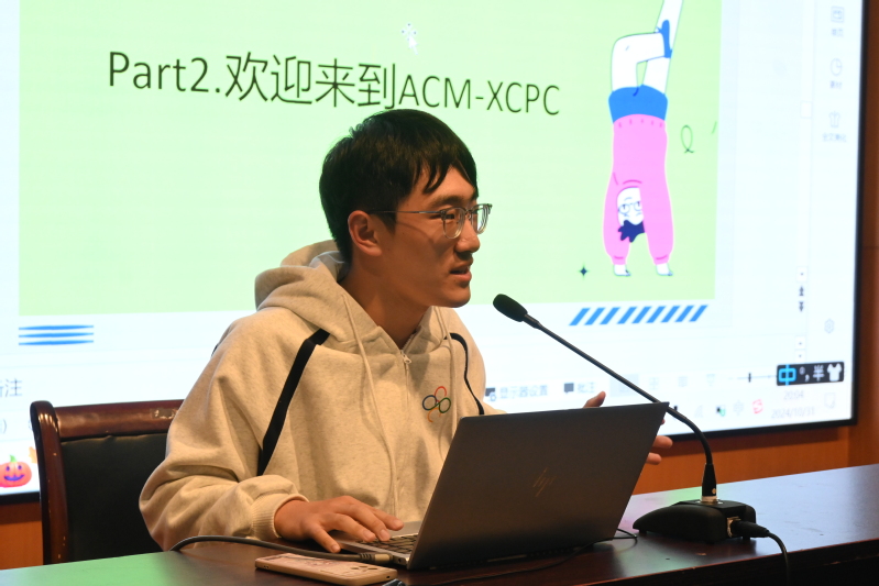 随后,学院计算机协会会长彭羽轩同学登台,展开了协会介绍以及竞赛宣讲环节。首先,彭羽轩学长介绍了协会的成立宗旨,详细介绍了协会的组织结构,包括各个部门的职责和分工等。接着,重点内容聚焦在了程序设计竞赛方面,尤其是备受瞩目的ACM类竞赛,彭羽轩同学对此进行了深入讲解。不仅如此,他还如数家珍般介绍了协会过往举办的一系列精彩纷呈的活动以及获奖经历,激发同学们积极参加竞赛,争取在竞赛成绩上创造全新突破,超越以往所取得的佳绩。最后,彭羽轩同学满含热情地向新生们发出诚挚邀请,欢迎大家加入计算机协会。他真挚地表示,在这个充满活力与创新的协会大家庭里,同学们可以结交志同道合的朋友,拓展专业视野,共同探索计算机世界的无限奥秘。