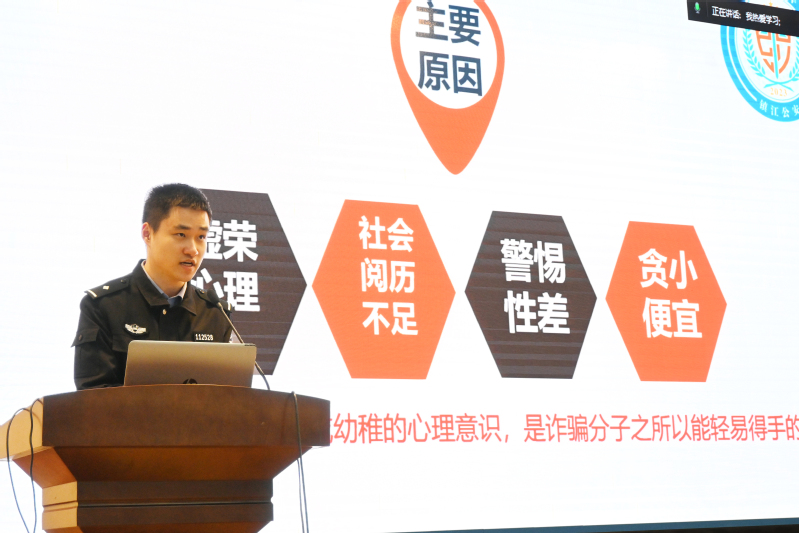 讲座开场,王警官明确指出安全与法制在大学生活中的重要性,强调其关乎每一位同学的成长发展,绝不可轻视。随后,他详细讲解了识别电信诈骗的三项显著特征,即不能准确确认其身份的人物、仅凭借电话网络等见不到真人的沟通方式以及涉及汇款转账的要求。王警官特别提醒,倘若遭遇此类情形,务必第一时间报警求助。与此同时,王警官紧密结合校园内发生的诸多真实案例,深入解析了常见的诈骗类型,如钓鱼网站网购类、金融类、贷款类、网络游戏类和网络兼职类诈骗等。