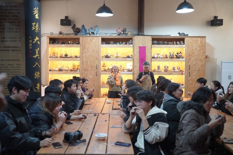 随后,同学们打卡创意孵化好去处太平泥叫叫场馆,重拾儿时的快乐玩起了泥巴,在省非遗传承人周保康老师的指导下,现场同学们兴趣盎然,亲手制作出蛇年吉祥物,并在欢声笑语中吹响了泥叫叫,“幸福的泥哨子”也带来了新年的平安和吉祥!