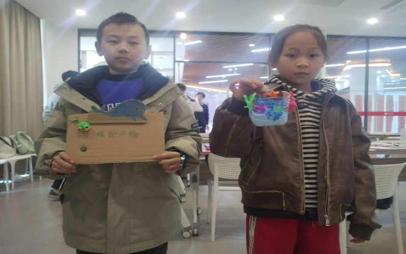 在知识普及环节之后,实践团成员携手社区老中幼居民,共同开展了“变废为宝 - 长江江豚”主题手工实践活动。活动现场,平日里堆放在角落的废弃纸箱、粘土等材料,在大家的巧手下被赋予了新的生命。大人和小孩们热情高涨,创意不断。有的小朋友用粘土精心捏制出可爱的江豚,并模拟出逼真的海洋环境;有的居民则充分发挥自己的创意,拿起废弃的快递纸箱,用彩铅绘出栩栩如生的江豚形象,再巧妙地裁剪下来。活动过程中,大人与小孩积极互动,温馨和谐的氛围洋溢在整个会议室,大家共同体验着循环利用废弃物带来的乐趣与成就感。