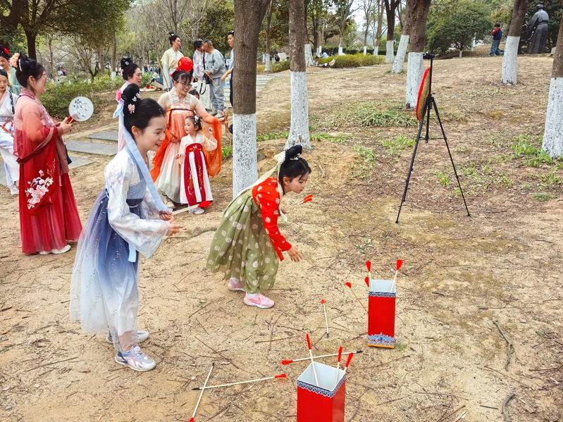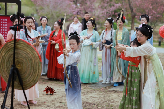 活动现场学院女教工们身着各式汉服,开启了穿越千年的文化之旅。老师们身着华服轻移莲步,赏春观景,合影留念,感受汉服文化的魅力。现场还开展了多种传统游戏,巾帼挽雕弓体验传统射箭,掷箭纳百福感受雅趣投壶,小组踢彩毽展现团队协作。最后,大家合影留念,为活动画上了圆满句号。