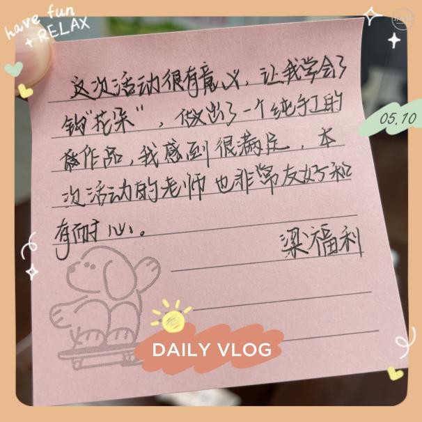 活动结束后,同学们纷纷写下心得体会。有同学感慨:“原本只是抱着尝试的心态来参加,没想到在钩织的过程中,感觉时间都慢了下来,心里的焦虑也被抚平,特别治愈。”也有同学表示:“和大家一起钩织,互相交流、互相帮助,不仅收获了新技能,还感受到了活动的温暖,期待下次还能参加这样的活动。”这些文字,字里行间都流露出对活动的喜爱与认可。
