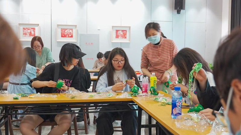 在市非物质文化遗产保护中心,活动围绕 “巧手编织线” 和 “闻香识艾” 两大主题展开。非遗编织达人现场传授五彩手绳制作技艺,生动讲述端午系五彩线祈福纳吉的传统习俗,学生们踊跃参与实践,沉浸式体验传统技艺魅力;另一部分学生则与社区居民携手合作,共同填充艾草、缝合香囊,感受 “辟邪驱瘟” 民俗文化。现场氛围热烈,各族青年在互动协作中深化了对中华文化的认同感与归属感。