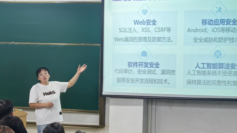 活动中,李会格老师生动地介绍了信息安全专业的概况、内涵与前景。她指出,随着数字化转型不断深入和网络安全威胁持续升级,信息安全已成为保障国家战略、企业运营与个人隐私的核心支撑。该专业融合计算机科学、网络通信、密码学等多学科知识,致力于培养既懂理论又重实践的高素质工程技术人才。李老师通过展示近年来发生的一系列网络安全事件,生动阐述了信息安全面临的现实挑战与战略意义,让新生们意识到信息安全的重要性。在核心课程讲解环节,李老师围绕密码学、网络安全、软件安全等核心课程进行了深入浅出的解读。她介绍了非对称加密、对称加密、数字签名等密码学算法,以及网络攻击防御、操作系统和数据库安全配置、云计算安全等网络与软件安全知识,帮助新生建立起清晰的专业知识框架。